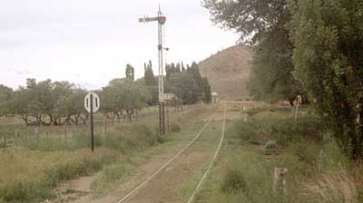El dato más interesante es el último. Claramente, la tarea más grande del ferrocarril era el transporte de material ferroviario a la punta de rieles para la extensión más al oeste. Se notan en esta tabla los tonelajes totales desde 1916 hasta 1941 para esta línea incluyendo sus ramales de trocha angosta. Más detallados datos de pasajeros y cargas en el comienzo de los años 1940 fueron publicados en la historia de los ferrocarriles argentinos por el FCE (3). Se notan debajo: Las cifras de pasajeros no son muy diferentes de las en la tabla de arriba, las de tráfico comercial para 1941 y 1942 no son mucho menos que los totales en la tabla de arriba indicando que los materiales ferroviarios ahora están mucho menos importante. Itinerarios Se ha estudiado el itinerario de 1946, y el horario público de trenes de pasajeros del fin de 1955, que está disponible en un apéndice. En 1946, había un tren de pasajeros directo desde Patagones hasta Bariloche tres veces cada semana, uno más que en 1934, y en adición un tren mixto directo una vez cada semana. Habían trayectorias para un tren de carga tres veces cada semana, y para un tren de carga, encomiendas y personal, también tres veces cada semana. Dado que los trenes diésel Ganz tipo 'Tren Bariloche' estarían en servicio en aquel tiempo, es sorprendente que la carrera mínima era 22 horas. También había un tren carguero y aguatero cinco veces cada semana hasta Valcheta. El documento de 1955 contiene, naturalmente, mucho menos información, pero parece que el 'Tronador' corría dos veces cada semana y un tren de pasajeros a vapor una vez cada semana. Héctor Guerreiro ha proveído muy bondadosamente un diagrama de las líneas de cabecera en Bahía Blanca que indica las precauciones permanentes hasta Bariloche. Se notan debajo. FC General Roca Se sabe solamente el conocimiento de dos boletos de la época del FC Roca. Este boleto es inusual, porque es fechada un día de una elección nacional. El segundo es para miembro de un grupo viajando desde Buenos Aires todo lo largo hasta Bariloche. SEFEPA, después Tren Patagónico Una pausa en la estación intermedia Pilcaniyeu. Hay dos vagones porta-auto entre el furgón y la máquina. Se ve una siriaca de estilo tradicional.