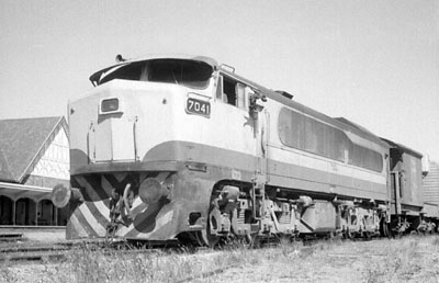 Esta vista de 1972 por Marcelo Arcas muestra la Baldwin Nº 7041 en Bariloche. Se ve claramente la inclinación delantera que es el origen de la denominación «nariz de tiburón».