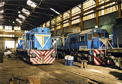 Tres tipos de diésel en los talleres San Antonio. A la izquierda está la Alco RSD35 Nº 6411; al centro la EMD GT22CW Nº 9070, y a la derecha la Alco RSD16 Nº 8238. (7)