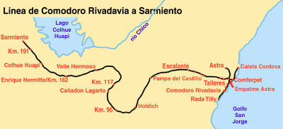 Últimamente fueron construidos ramales cortos desde Km 8 o Empalme Astra, para el acceso a los yacimientos en Astra y Comferpet. El segundo nombre es la abreviatura de la empresa COMpañía FERrocarrilera y PETrolera. Un mapa a gran escala se puede encontrar en un apéndice. Una pacífico, el parque motriz principal de la línea, espera en Astra la carga de un tren de vagones petroleros. Viendo que hay hombres sobre el ténder, parece que la locomotora está abasteciéndose de combustible.