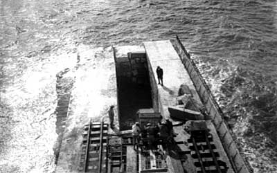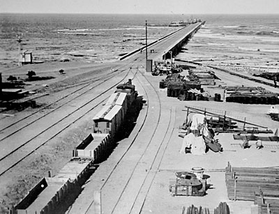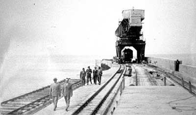 El rompeolas La foto de abajo muestra la grúa y dos tipos de vías - una línea doble de trocha 75cm, y dos más de trocha ancha. El fotógrafo estaba sobre un vagón de trocha ancha. Esta vista, desde la grúa muestra como las vías de trocha angosta fueron hechas muy cuidadosamente para la grúa, probablemente usando rieles de trocha ancha. Todavía el rompeolas se encuentra en construcción y en el centro unos obreros tiran concreto en el boquete. Es posible que haya una línea de trocha de 60cm abajo a la izquierda. La curva visible a la izquierda indica que la vista es cerca el extremo de las obras más al mar.
