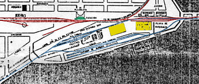 Implica otra mapa que la vías tenían rumbo más sudoeste al salir de la estación principal del FCE. Se vale notar que la reclamación indicada en esta hoja nunca ocurrió. Muestra este mapa sin fecha una propuesta para extender la ciudad sobre la restinga sur. Aunque no se hizo la obra sobre tan grande extensión, es posible que el mapa muestre la traza del ferrocarril de trocha 75cm y claramente Pozo 99 indica el origen de las denominaciones Campamento 99 y Playa 99.