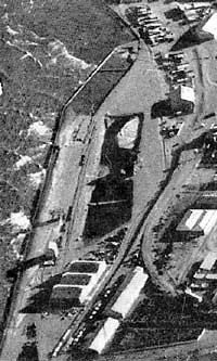 Una vista aérea, también del sitio web del Señor Fiordelli muestra el terreno reclamado ahora en uso. El galpón original está al pie de la foto y los dos desvíos mostrados arriba parecen ser en estado más permanente.