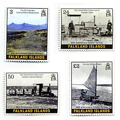 Esta fotografía es el origen del diseño del sello de correo de 54 peniques de las Islas Malvinas (debajo). La máquina tiene Falkland Islands Express pintado sobre el tanque. Hay sillas desmontables en los vagones para el transporte de obreros. (Fotografía de la colección del museo Stanley). Los títulos 1st class, 2nd class, 3rd class y Smoker (fumador) y sobre el tanque de la máquina parecen implicar una broma. Viajando a vela por los rieles Una estampilla (debajo) muestra un vagón viejo a vela, pero en los años 1920s el estilo era más avanzado. La foto a la izquierda muestra un carro con una vela y un palenque con mecanismo unido al eje trasero para permitir el movimiento a mano contra el viento. Presumiblemente los vientos occidentales hacían fácil el viaje desde Moody Brook hasta Navy Point, pero la vuelta requería de más trabajo.