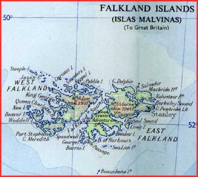 El expreso de las Islas Malvinas Abastos a la estación de radio El ferrocarril estaba al otro lado de la bahía del pueblo Puerto Argentino. Su longitud era de cinco kilómetros. El transmisor poderoso de radio Marconi fue construido para mejorar las comunicaciones al hemisferio norte siguiente las batallas navales en el Atlántico Sur en el fin de 1914. Habían sido destruidos dos navíos de guerra británicos en la batalla de Coronel; pués cuatro alemanes en la batalla de las Falklands, dejando al Dresden a proseguir su notoria campaña. Mapa de las Islas Malvinas El mapa de 1957 (debajo) indica las islas con Stanley sobre la costa oriental. El archipiélago extiende 250km oeste al este.