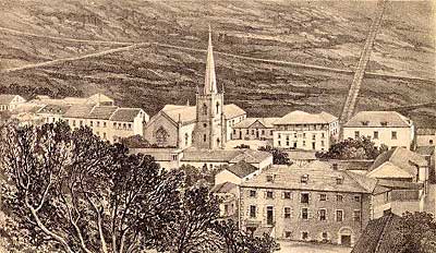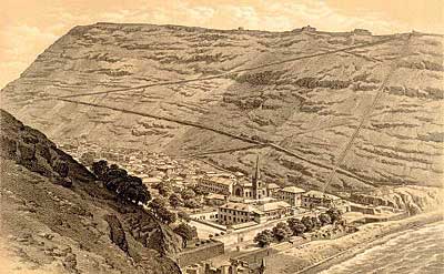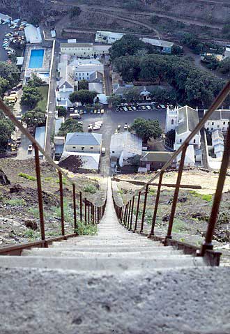 ¡Más afuera en el Atlántico — dos ferrocarriles muy malolorosos! Están cuatro otras islas en el Atlántico Sur. Dos tenían ferrocarriles. Estas dos extienden verdaderamente las fronteras de este sitio web, pero no conozco otra página que trata de estas líneas. Saint Helena y Ascension están visibles en el mapa arriba. Las otras islas — Tristan da Cunha y Trinidad — no tenían ningún ferrocarril y no están ilustrada en el mapa. Una línea tranviaria para la suciedad de la noche... Una cosa distintiva del pueblo es Jacob's Ladder (= escalera de Jacobo) con sus 699 peldaños, hasta un fuerte arriba. Fue construida en 1829 con un tranvía inclinado de trocha cuatro pies (1,22m) (1). El Señor G W Mellis fue ingeniero de la obra, bajo la dirección del Gobernador, el General de Brigada Dallas, de la Compañía Honorable del India Oriental (2). Los origines citadas en 1828 era las rampas en Bridgnorth y Monmouth (Inglaterra) (13). A solo cuatro años la isla cambió de ser bajo la regla de 'John Company' a la del gobierno británico. Parece que la rampa fue construida particularmente, pero con inversión gubernamental. En 1832 fue comprada de su patrón por el gobierno isleño en la suma de £882 10 s (882 libras y 10 chelines). La grabación de 1863, debajo, muestra Jamestown con la rampa visible claramente por el precipicio a la derecha (3). Esta ilustración y la otra más abajo fueron descubiertas en la biblioteca y archivo virtual Saint Helena, mantenido por el Señor Barry Weaver. Usaban burros o mulos para hacer andar un cilindro remolcador en la cima. Su tarea principal era traer la suciedad de la noche arriba por la noche para usarla como fertilizador en los campos. También llevaban arriba abastecimientos al fuerte Ladder Hill (= Colina Escalera) y abajo, al pueblo, los productos de las chacras. Aparentemente el rompimiento de las cadenas remolcadoras tenía consecuencias no agradables debajo. Un sistema de freno de emergencia fue inaugurado usando picos arrastrados que podían cavarse en la línea en caso de escapada. Se describió y se ilustró en ediciones de la Mechanics' Magazine en 1832 y 1843. Las páginas relevantes están disponibles como un apéndice. La rampa estaba abandonada antes de la reconstrucción de la escalera en 1875. Hay más detalles en un libro de 1875 (14) por el Señor J.C. Melliss, el ex mensurador e ingeniero de la isla, quien era el hijo de Señor G. W. Mellis, el constructor de la rampa. Debajo sigue una cuenta del intento de la rampa, su construcción y abandonamiento: La totalidad de la basura de los establos, corrales etc del pueblo es tirada en el mar en lugar de ser enviada a las colinas para volverla al suelo. Por razón de esta práctica durante muchos años, el suelo esta casi estéril. Adicionalmente, una grande cantidad de guano, recogido por la costa, es exportada a Europa y no usada en la isla. Es lamentable que el Gobierno permite este mercado solamente para ganar recibos de unos diez chelines (posiblemente dos o tres pesos) por tonelada. Con tal sistema no es sospechoso que el granjero recibe una cosecha pobre y los fruteros mueren. Lo sospechoso es que él gaña alguna cosecha. Hace cuarenta y dos años el general Dallas, gobernador de la isla, entendiendo los males de este sistema y para proveer un método económico llevar el estiércol del pueblo a las colinas y al suelo del campo, hizo construir la escalera o rampa. Esta obra de arte fue hecho bajo el mando de Teniente G.W. Mellis, un oficial de la artillería, comprendió una escalera de 275 metros, con más de 600 pasos, entre Jamestown y Ladder Hill (= Colina Escalera) a un ángulo de 39 o 40 grados, y un tranvía a cada lado, con vagones, cuerdos y maquinaría al cima. Por este método el estiércol fue elevado unos 182 m a un depósito de donde fue sacado fácilmente por los granjeros. Uso secundario del Ferrocarril San Helena era la transportación de abastecimientos desde el pueblo hasta la guarnición del fuerte de Ladder Hill. Sería útil hoy para estos dos usos. Es lamentable que la obra está caída en desuso y mal estado, la madera estando comida por los hormigones blancos. Se dice que estos insectos llegaron a Ladder Hill en los durmientes longitudinales de madera. La segunda grabación es desde un punto más cerca y fue grabada en 1857 (4). Otra vez la rampa esta visible claramente. Una vista de hoy por el Señor Barry Weaver, mire por abajo de la escalera hasta Jamestown. Están a cada lado de los peldaños una rampa inclinada de bloques de piedra. Mientras la obra fue reconstruida en 1875, estas rampas pueden ser la base de la vía antigua. Fueron publicados los detalles del equipo, el guinche y los arreglos contra falta en la Mechanics' Magazine en1832 y 1834. Están disponibles en la viz inglesa en un apéndice esos artículos escaneados. Se encuentra más información sobre el tema del funicular de Ladder Hill en el sitio web Funimag. Carbón de piedra y agua dulce Mucho más tarde, en 1901, Rupert's Bay era el sitio de una planta desalinizadora del agua de mar para los campamentos de prisioneros de guerra de la guerra sudafricana. Se armó y se probó la planta, pero nunca fue usada. La chimenea grande de ladrillos sobrevive. El mapa de abajo muestra el sitio de la planta desalinizadora al sud de la bahía. Se nota una vía de zorra, posiblemente de bastante longitud porque sale del mapa en dos puntos. Pude ser la línea norte la que traía el carbón desde el desembarcadero; la línea meridional tiene rumbo a tierra por el valle. La chimenea grande mostrada en la foto más abajo es el cuadro oscuro un poco al sur de la vía férrea este-oeste. Se ve debajo una foto de calidad muy inferior de la planta desalinizadora. Pero vale la pena publicarla porque muestra claramente la vía y un vagón de cuatro ruedas, posiblemente tirado por un caballo o una mula. Parece que la trocha sea de 61 cm or muy cerca. El fotógrafo tenía su cara hacia el este haci